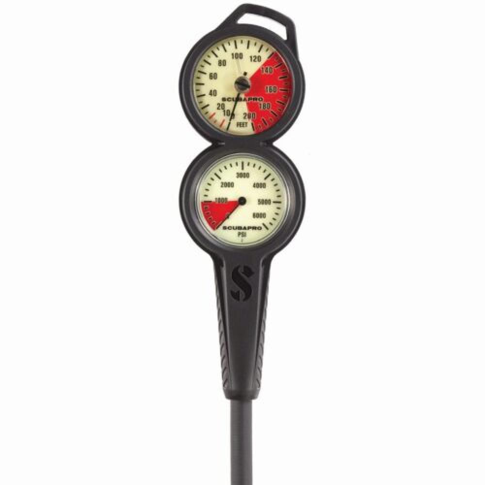 Two-gauge console includes a compact brass case pressure gauge and a compact oil-filled analog depth gauge with linear Bourdon tube design.