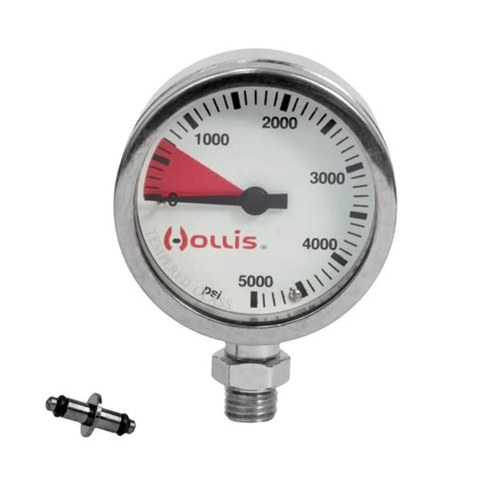 The Hollis 2 inch Brass SPG is rugged and easy to read. It works great as a primary or backup pressure gauge. The Hollis 2 inch Brass SPG is for the beginner or the most advanced technical divers. The Hollis 2 inch Brass SPG comes with a Luminescent face plate with an operating range of 0 to 5000 PSI or even an option for 0 to 360 BAR. The Hollis 2 inch Brass SPG has a chrome plated brass housing and uses a bourdon tube for calibration and accuracy. Equipped with scratch resistant glass. The Hollis 2 inch Brass SPG is oxygen cleaned for use of pure Oxygen or specialty blends for stage and deco bottles or just plain old Nitrox mixes.