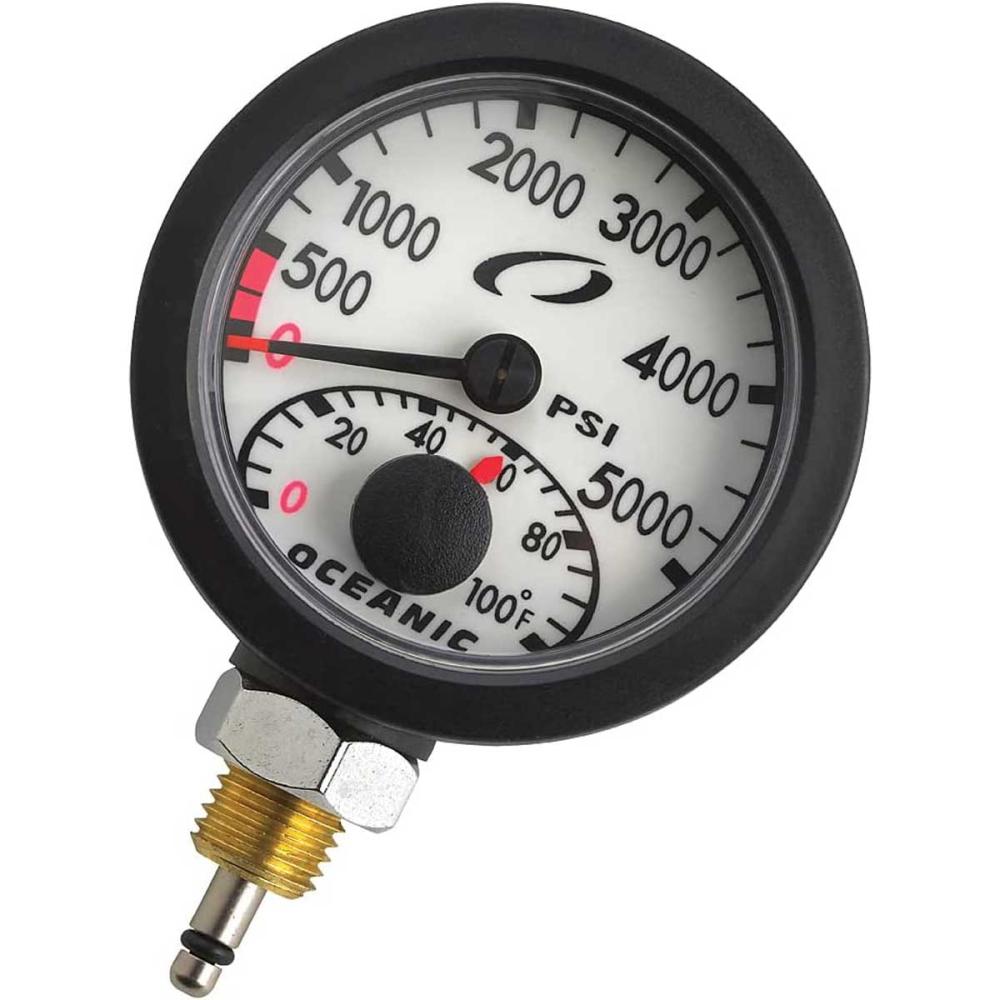 The Oceanic Submersible Pressure Gauge SWIV Module without Tab is Nitrox compatible to 50% O2. Ocean Gloluminescent gauge face absorbs light and glows approximately 7 times longer than other materials with an integrated temperature gauge. This SPG has a shock resistant bourdon tube mechanism with a one-way safety valve.